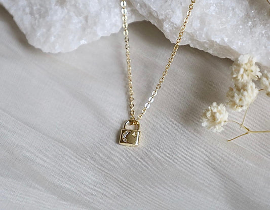 Gold Tiny Moon and Star Padlock Necklace. 925 Sterling Silver