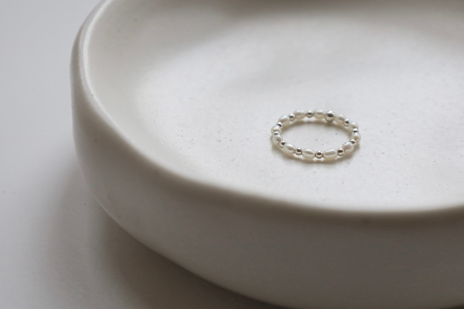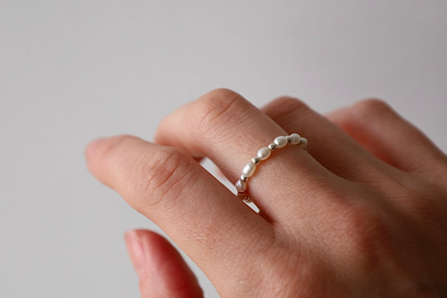 Delicate yet versatile, this stretch ring features lustrous freshwater pearls elegantly spaced with shimmering sterling silver beads. The flexible design ensures a comfortable fit for most finger sizes, making it perfect for layering or wearing alone. Each pearl exudes natural elegance, while the silver accents add a subtle modern sparkle—ideal for everyday wear or special occasions.