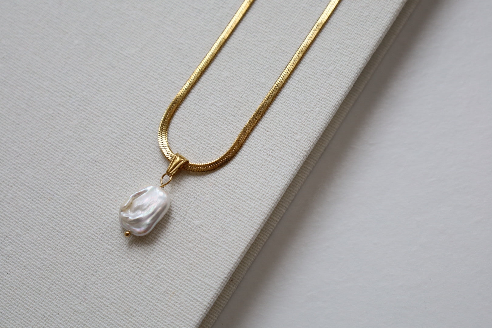 The Grace Necklace captures the essence of timeless beauty with its luminous baroque pearl, suspended from a sleek 18k gold-plated Herringbone chain. Each pearl is naturally unique, reflecting light with a soft, iridescent glow that complements every skin tone.