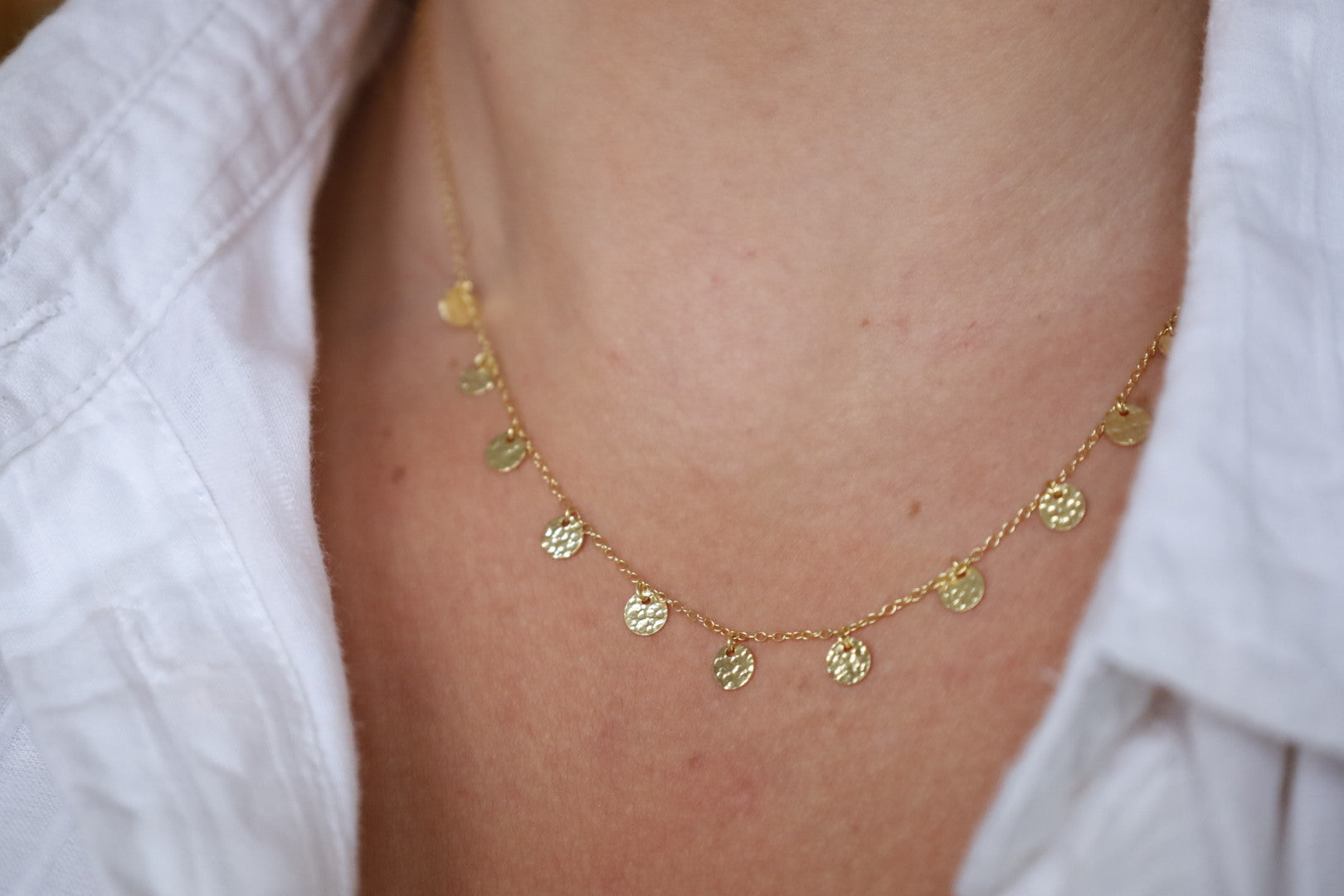 The Reflection Disc Necklace is a delicate textured, disc necklace designed to shimmer with every movement. Featuring flat, lightly hammered textured discs suspended along a fine trace chain, this elegant piece catches and reflects the light beautifully.